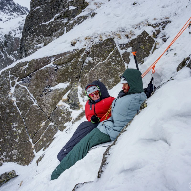 Le X 450/800 d’Aura est un sac de couchage qui se démarque par sa forme et sa conception. Il a été conçu spécialement pour l’escalade et l’alpinisme, pour des bivouacs en conditions difficiles. Sa forme anatomique ajustée résulte d’une conception prenant le moins de place possible au bivouac, d’une recherche de confort aussi bien allongé que assis, sans perdre en isolation. Pour cela, il dispose sur les côtés au niveau du torse, de panneaux latéraux qui augmentent la thermicité.