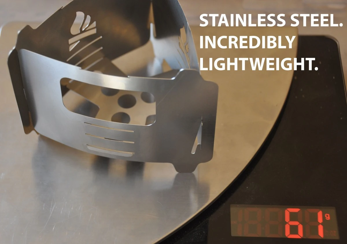Il est fabriqué à partir d’acier inoxydable de 0,3 mm d’épaisseur. Il est composé 5 éléments qui s’assemblent pour former le réchaud. Le montage est facile, rapide et ingénieux. En effet le système d’encoches permet d’obtenir un réchaud solidement formé (malgré la légèreté) et stable.