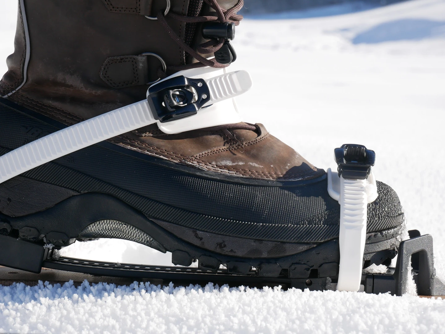 Au-delà de cet aspect très pratique, le système est simple d’utilisation et offre un bon maintien latéral. Le système ressemble à des fixations de surf des neiges. 2 boucles micrométriques permettent un serrage autour des chaussures. Une plaque flexible permet de marcher en offrant un bon déroulé de pied. L’EA 2.0 de OAC fonctionne avec une large gamme de bottes et chaussures à semelles souples.