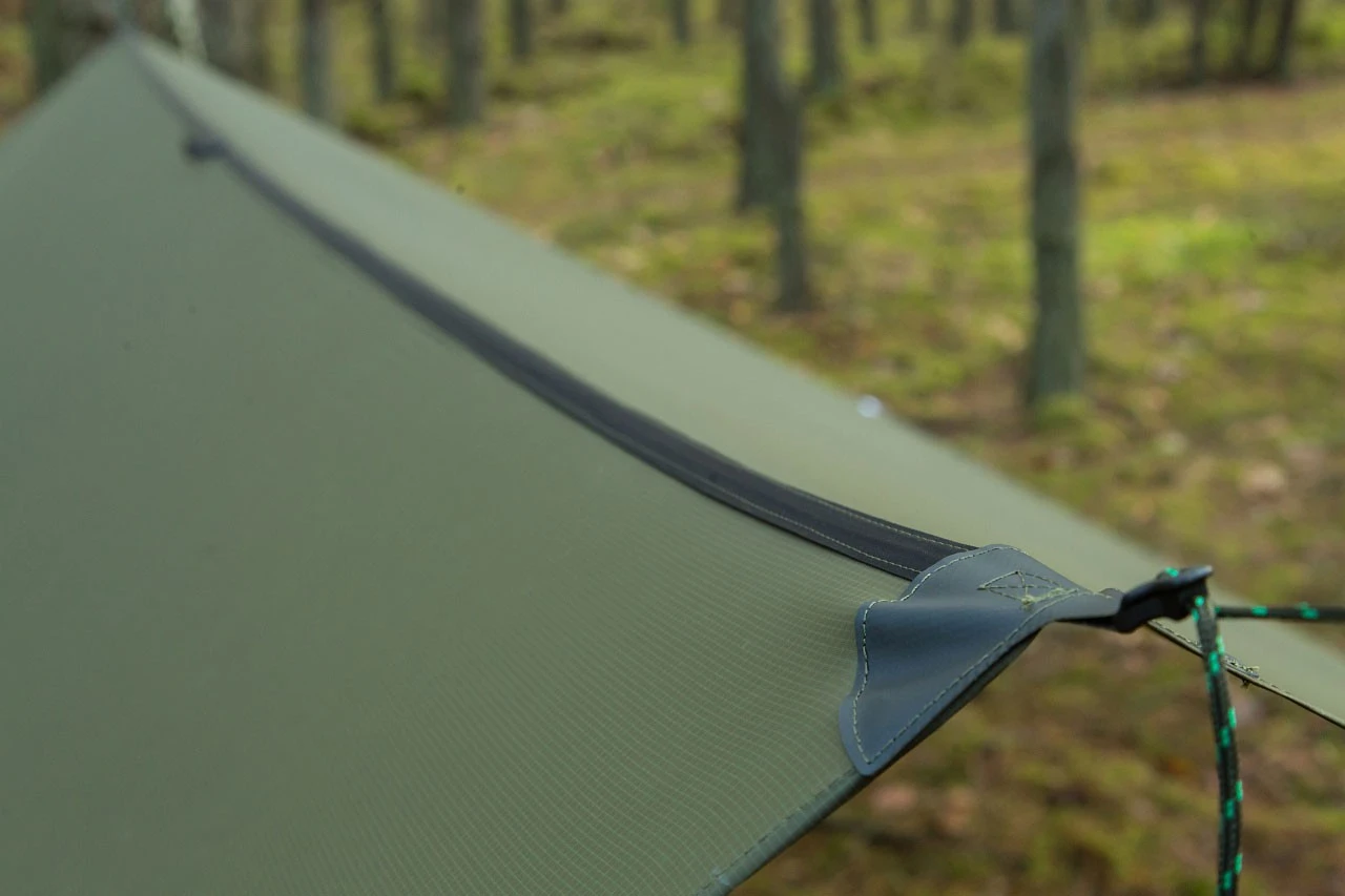 Le Groza de Lesovik est un tarp ultraléger, de grande qualité fabriqué en Silnylon (nylon siliconé). Cette bâche pèse seulement 450 grammes pour une surface totale de 300 x 300 cm.