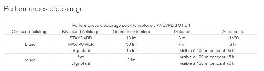 - 2 niveaux d’éclairage, couleur blanche ou rouge, mode fixe ou clignotant