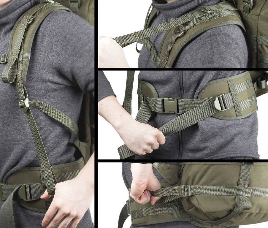 Le système de portage a été conçu pour des conditions exigeantes. Les bretelles ergonomiques et la ceinture de hanche robuste avec un coussin de rembourrage forment un ensemble confortable et durable. Les bretelles et la ceinture de hanche soutiennent et répartissent la charge uniformément. Les bretelles sont dotées de boucles de réglages en plastique Delrin qui ont une excellente résistance à la tension, aux chocs et au froid.