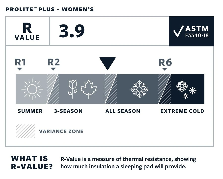 Léger et compact, le Prolite Plus Women’s contient une mousse alvéolée confortable. Il dispose d’une épaisseur de 3,8 centimètres. C’est un matelas 3 saisons bien isolé, il peut être utilisé jusqu’au début de l’hiver, voir un peu plus. Son R-Value est de 3.9 avec la nouvelle norme ASTM F3340-18.
